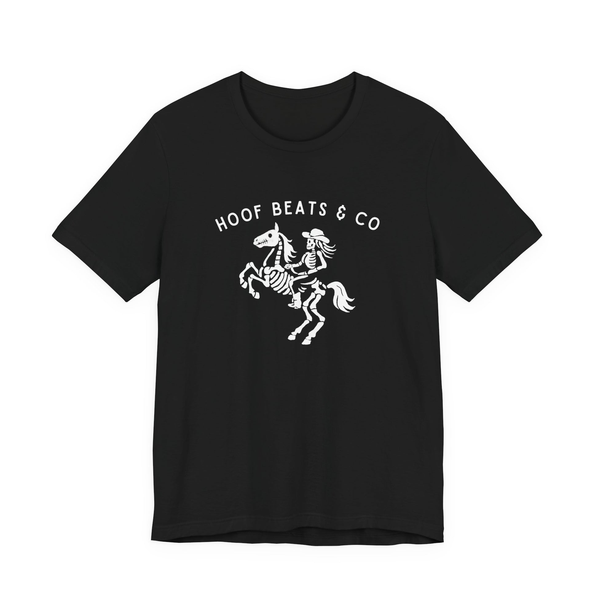 This Ghost Rider Jolly Roger tee from Hoof Beats & Co embodies the pirate spirit—fearless, untamed, and ready to chase any horizon. It showcases a bold skeleton cowgirl charging forward on her bony steed, white bones blazing against midnight black in true Jolly Roger style.